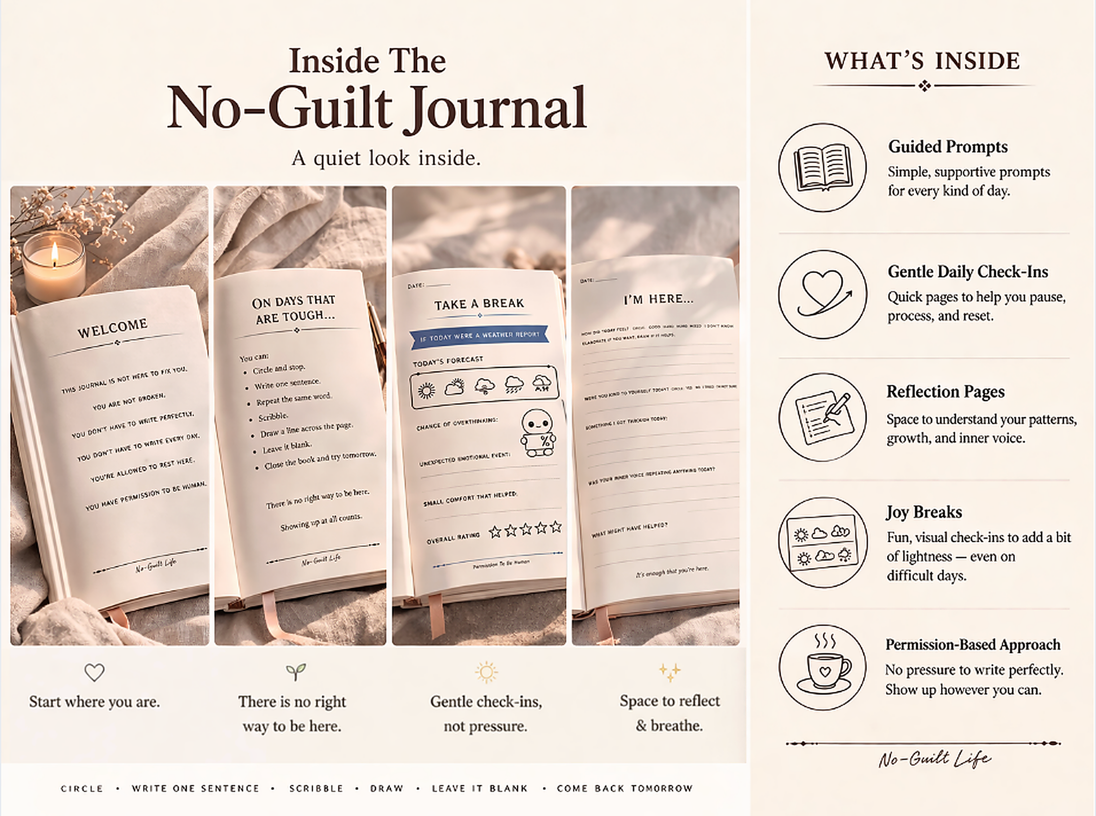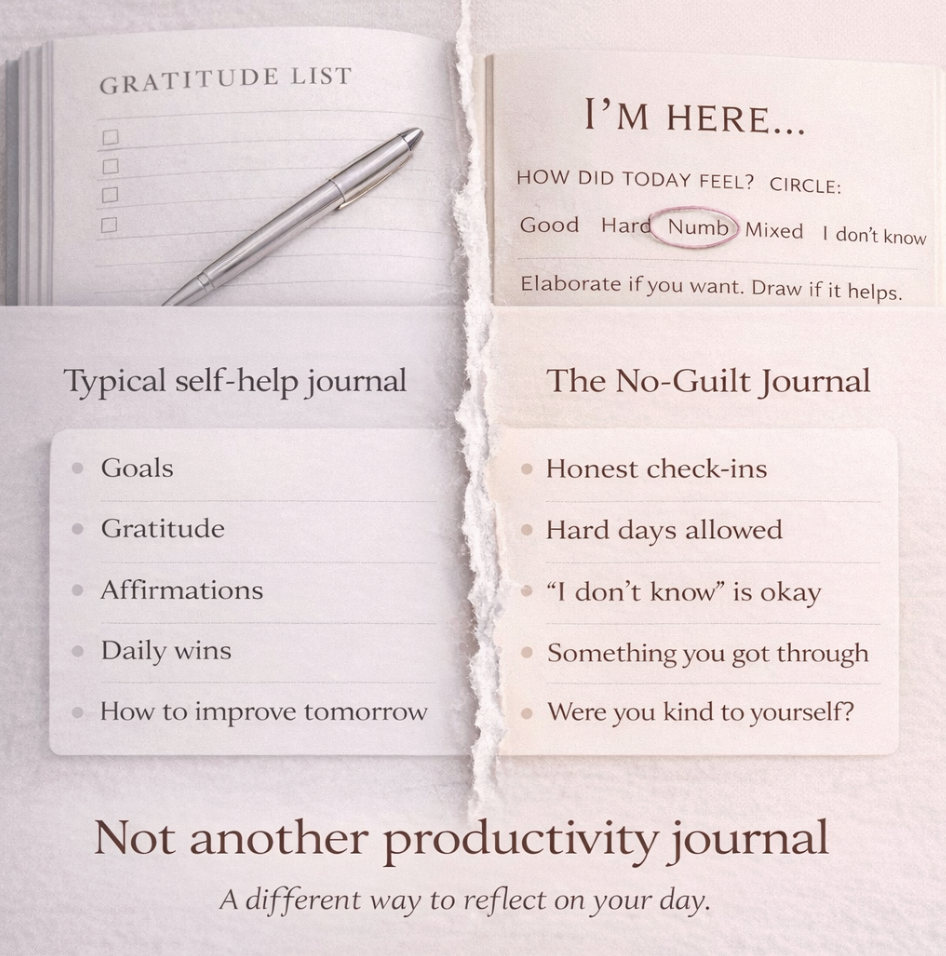 The No-Guilt Journal makes room for hard days, mixed feelings, and the reminder that just showing up counts too.